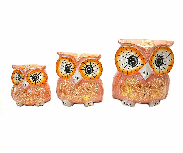 フクロウ インテリア 置物 木彫り ふくろう 木製 カラフル オレンジ 3点セット E オブジェ 彫刻 卓上 玄関 バリ アジアン タイ 雑貨 小物