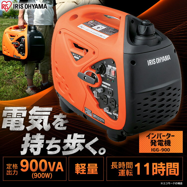 ●商品サイズ(cm)幅約28.1×奥行約48.5×高さ約39.9●乾燥質量約14.4kg●型式多極界磁回転型●力率1.0●定格周波数50Hz/60Hz 切替式●交流定格出力:0.9kVA定格電圧:100V定格電流:9A●直流定格電圧:12V定格電流:5A●装備交流コンセント:アース付3本足コンセント×2個交流過電流保護装置:リセットスイッチ直流コンセント:八型コンセント×1個直流過電流保護装置:リセットスイッチ●エンジンエンジン種類:空冷4ストロークガソリンエンジン総排気量:50cm3使用燃料:無鉛レギュラーガソリンスパークプラグ:CR4HSB(NGK)エンジンオイル:4サイクル用エンジンオイルSE級以上 SAE10W-30エンジンオイル規定量:0.23L●燃料タンク容量(赤レベル)2.8L●定格連続運転時間(赤レベル)3時間●1/4負荷(エコモード)連続運転時間(赤レベル)11時間●始動方式リコイル式●使用環境温度0℃〜40℃●付属品エンジンオイル給油用じょうご、点火プラグレンチ、ドライバー、直流電源用12Vバッテリー充電ケーブル(検索用:発電機 インバーター ポータブル発電機 自家発電機 発電 電気 コンパクト アウトドア 作業現場 防災 DIY コンパクト発電機 発電器 4967576474399)★